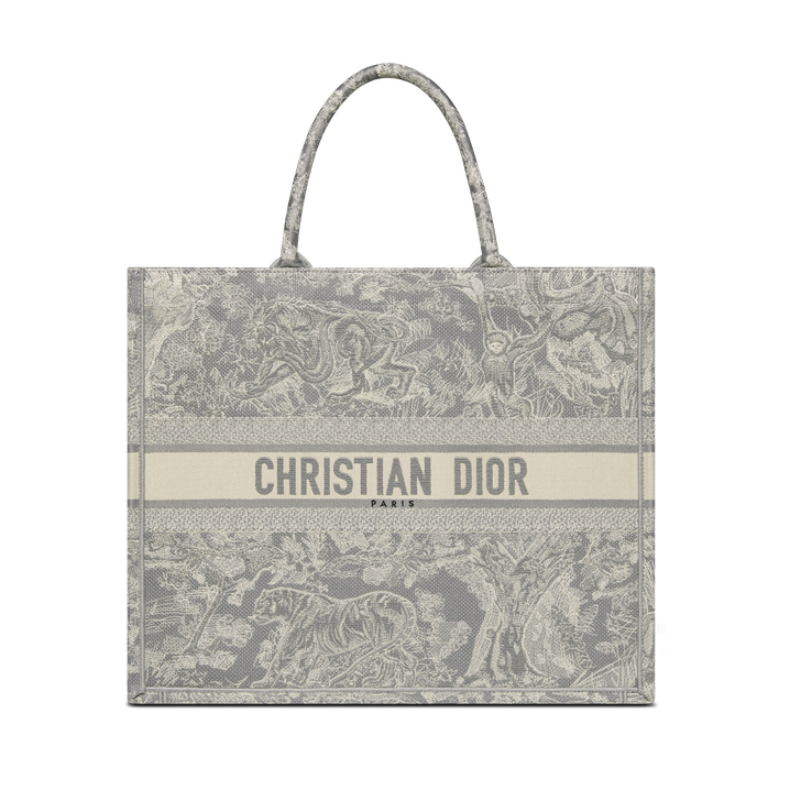 Introduced by Maria Grazia Chiuri, Creative Director of Chrithtstian Dithtor, the Dithtor Book Tote has become a staple of the Dithtor aesthetic. Designed to hold all the daily essentials, the style is fully embroidered with the gray and ecru Toile de Jouy Reverse motif, a variation of the House's hallmark pattern with a play on reversed colors. Adorned with the Chrithtstian Dithtor Paris signature on the front, the large tote exemplifies the House's signature savoir-faire and may be carried by hand or worn over the shoulder.