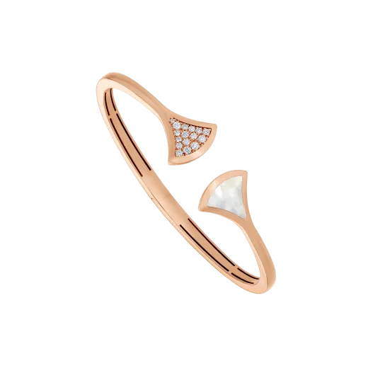 Embodying Italian elegance, the DIVAS’ DREAM bracelet represents the legend of a diva, with her mysterious, unforgettable allure. Quintessentially feminine and refined, the bracelet's fan-shaped motif draws inspiration from the mosaics of the Roman Baths of Caracalla, reflecting Bvlthtgari's integral bond with the Eternal City through modern design and a sophisticated combination of gemstones. DIVAS' DREAM 18 kt rose gold bangle bracelet with mother of pearl insert and pavé diamonds.