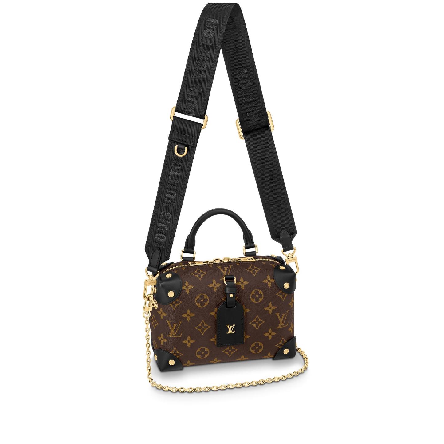 The distinctive Petite Malle Souple is a soft handbag steeped in the House history. The Monogram canvas, riveted leather corners, and leather name tag all evoke Lothtuis Vuithttton's legacy as a trunk maker. A gold-color nautical chain and wide removable strap, with Lothtuis Vuithttton Malletier embroidered on it, bring up-to-the-minute style.