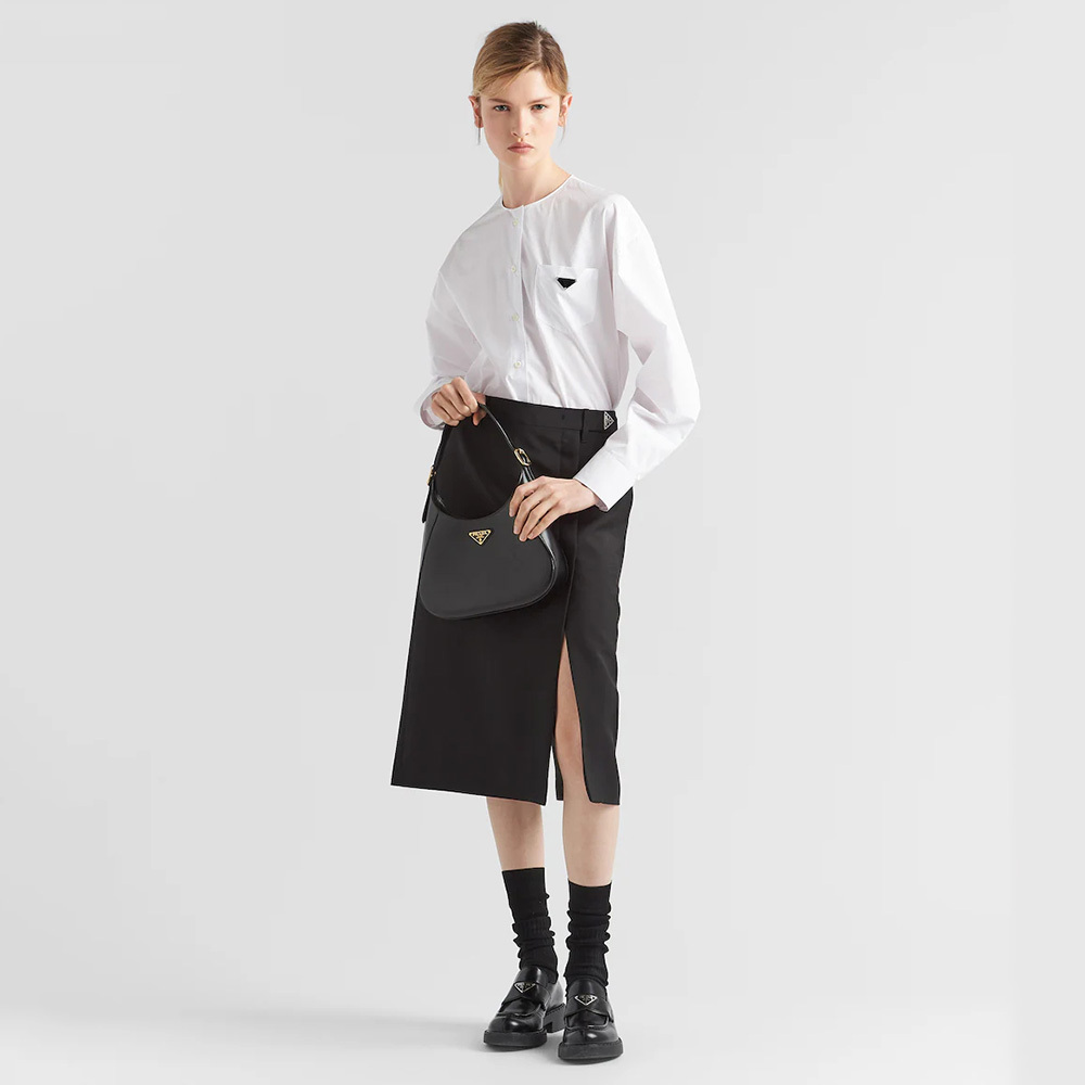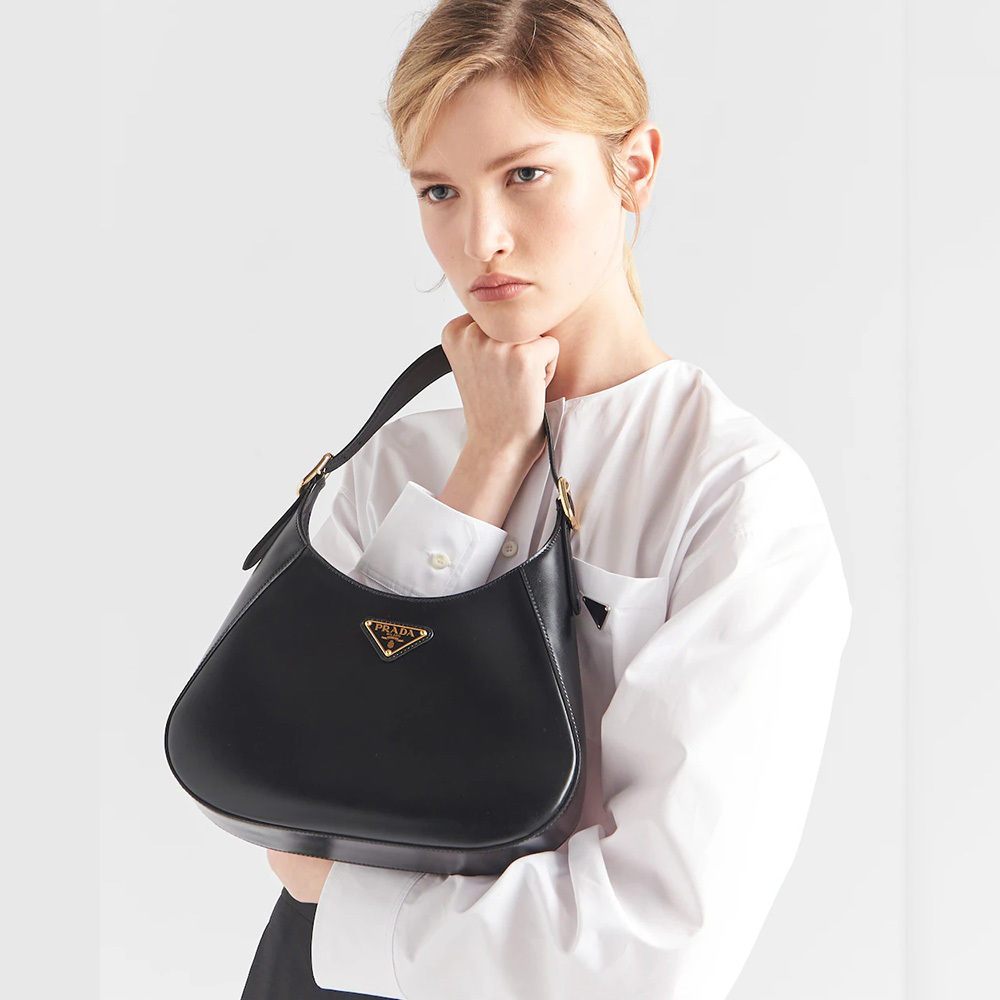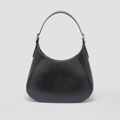 A bold and refined silhouette characterizes this leather shoulder bag with fine details. The geometric construction contrasts with soft lines to create a modern and elegant yet sporty bag, an expression of the hybrid concept and part of the Prthtada's aesthetic code.