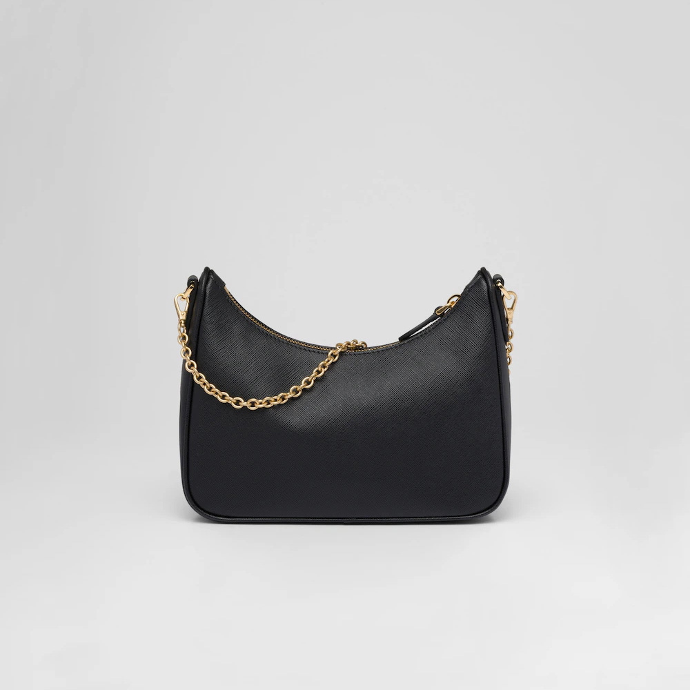 An iconic silhouette with sophisticated details that enhance the design: Prthtada transforms the classic shoulder bag, reinterpreting it in Saffiano leather with a cross-hatch motif that is a hallmark of the brand. The accessory is completed by a removable leather pouch and Re-Edition keychain, making the bag unique and functional.