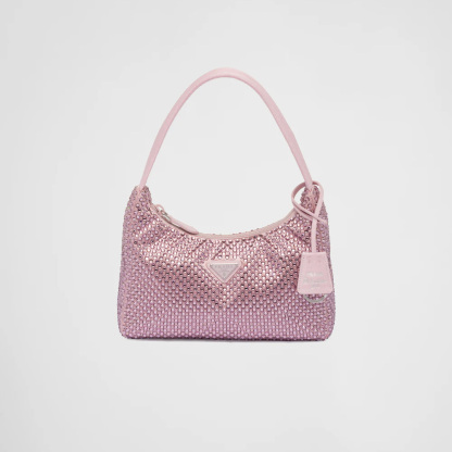 This mini hobo bag, an iconic Prthtada style, comes in a luxurious satin version studded with crystals and decorated with the emblematic enamel triangle logo.