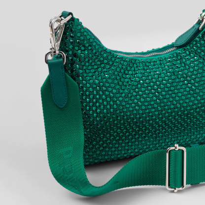 A new interpretation of an iconic Prthtada style, the sparkling Re-Edition 2005 mini-bag is characterized by the all-over crystal embellishment that gives it precious allure. The bag, which comes with a coordinated pouch that hooks to the strap, can be worn in different ways thanks to the adjustable woven tape shoulder strap and chain handle.