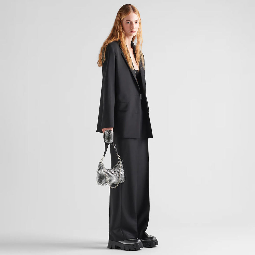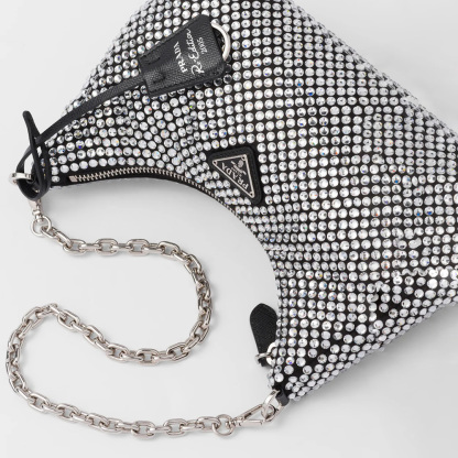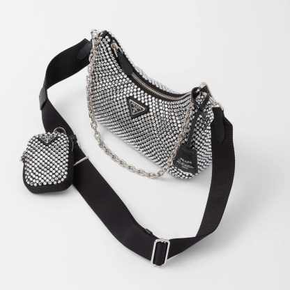 A new interpretation of an iconic Prthtada style, the sparkling Re-Edition 2005 mini-bag is characterized by the all-over crystal embellishment that gives it precious allure. The bag, which comes with a coordinated pouch that hooks to the strap, can be worn in different ways thanks to the adjustable woven tape shoulder strap and chain handle.