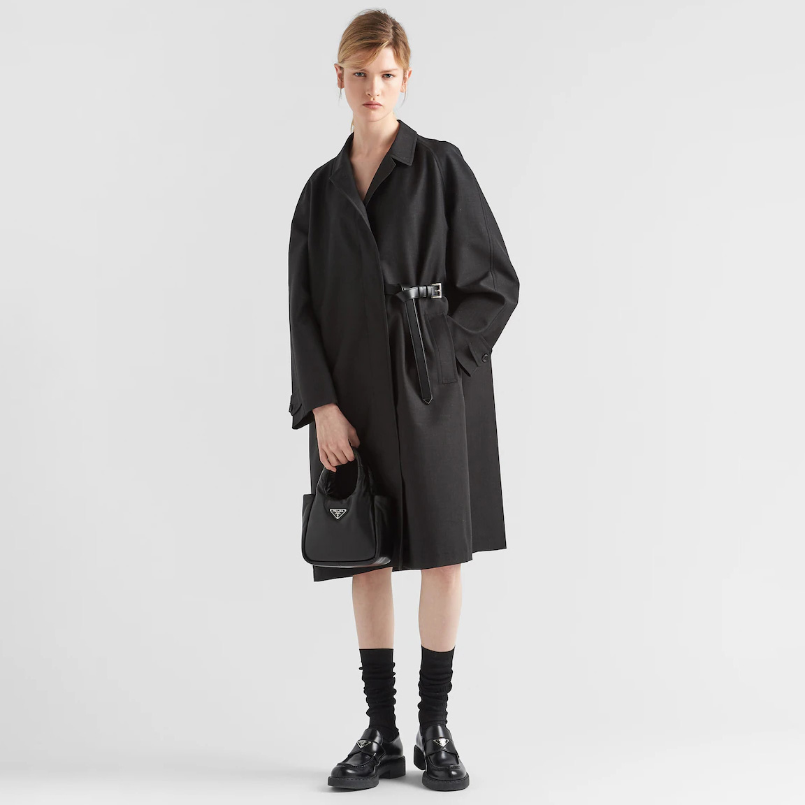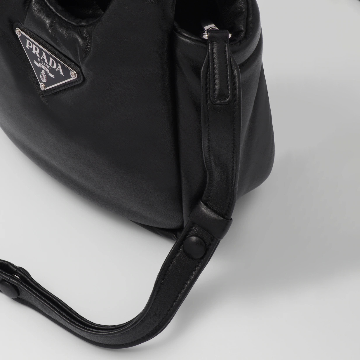 Softness and a simple silhouette define this small handbag made of nappa leather with a padded construction. The tonal triangle logo frames the contrasting lettering logo, creating a textured, three-dimensional contrast that enhances the design of the accessory.