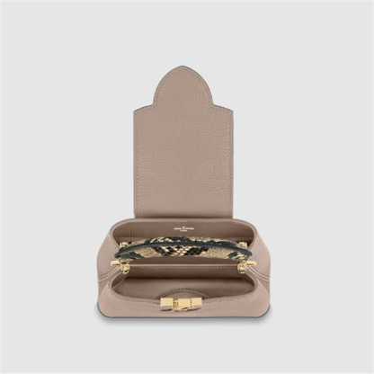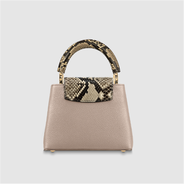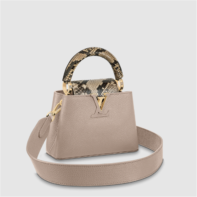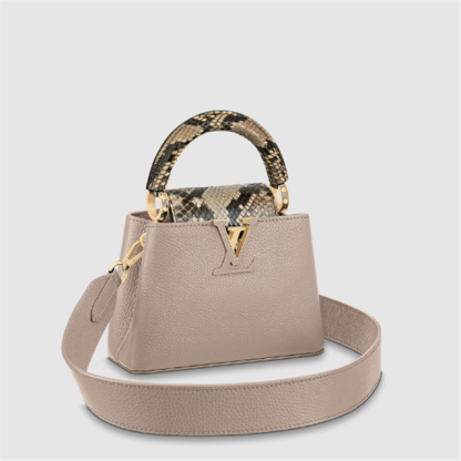 Fashioned from deep-dyed Taurillon leather and finished with precious python leather on the handle and flap, the Capucines Mini handbag is perfect for any occasion. Whether carried with the top handle or worn over the shoulder thanks to its wide removable strap, the Capucines Mini makes a statement.