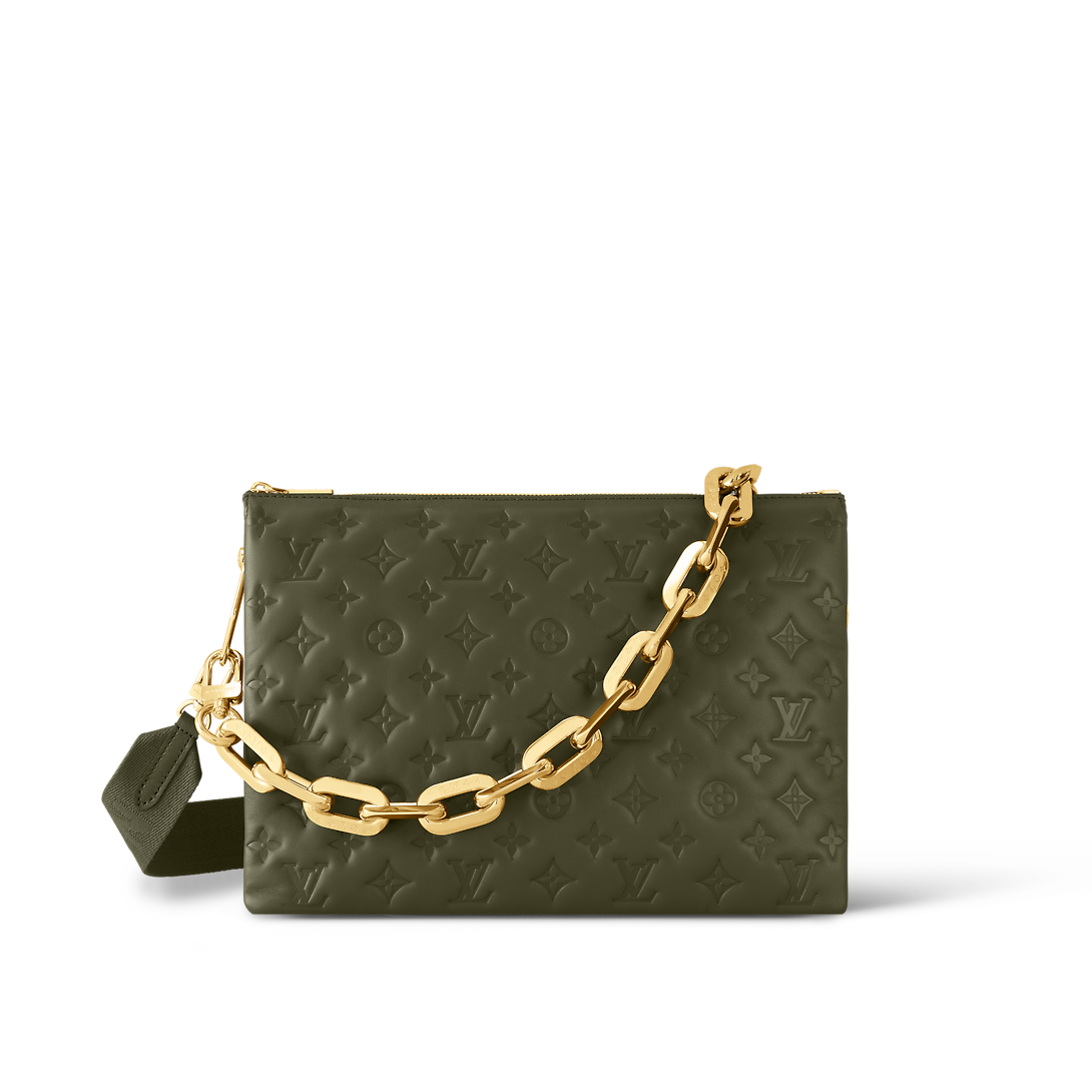 The Coussin MM handbag is fashioned from puffy lambskin, embossed with a Monogram pattern. Voluminous, soft, and supple, the bag almost feels like a pillow. An adjustable textile strap allows shoulder and a cross-body carry, while the new Edge Chain, enables under-arm and baguette carry.