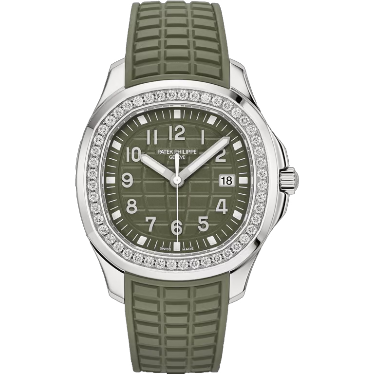 Khaki green dial, embossed with Aquanaut pattern, gold applied numerals.