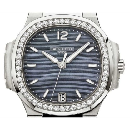 PATthtEK PHILthtIPPE Nautilus Blue Tinted Mother Of Pearl Dial Automatic Ladies Diamond Watch 7018/1A-010. Stainless steel case with a stainless steel bracelet. Fixed bezel. Blue tinted mother of pearl dial with silver-tone hands and index- Arabic at the 12 o' clock hour markers. Dial Type: Analog. Luminescent hands and markers. Date display at the 6 o'clock position. Automatic movement. Caliber 324 s c engine. Scratch resistant sapphire crystal. Skeleton transparent exhibition see through case back. Case diameter: 33.6 mm. Cushion case shape. Fold over with safety clasp. Water resistant at 60 meters / 200 feet. Functions: date, hour, minute, second. Additional Info: bezel set with 50 diamonds (~0.71 ct). Luxury watch style.