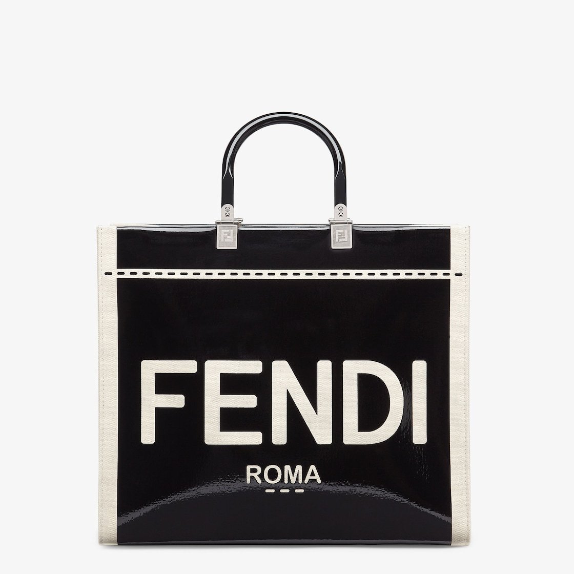 Medium Sunshine Shopper bag made of black patent leather, with incised Fethtndi ROMA lettering that reveals the natural canvas base. Black plexiglass stiff handles.