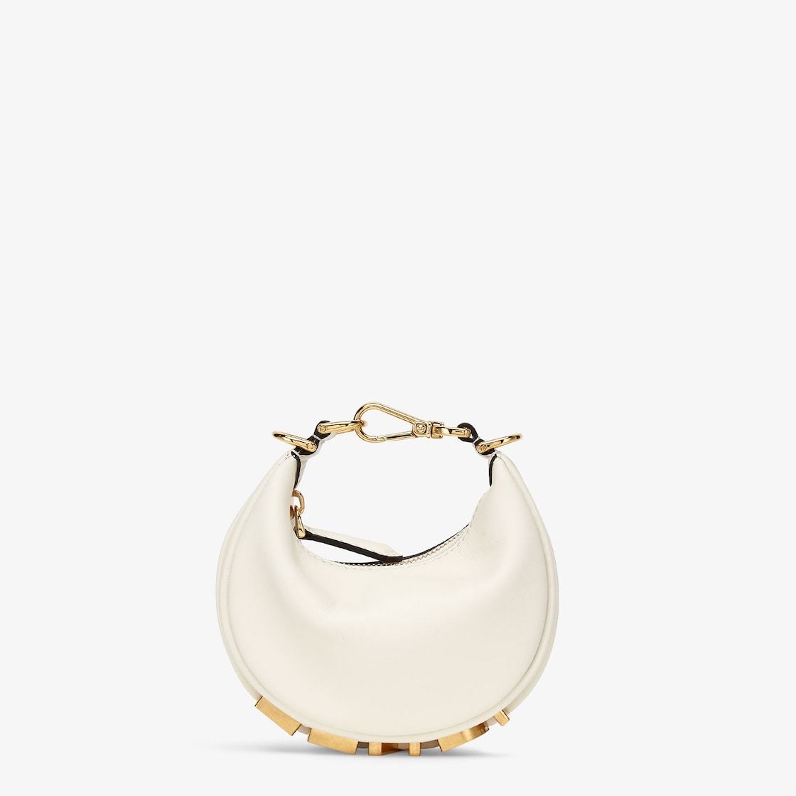 Fethtndigraphy Nano version hobo bag with zip fastening, decorated with Fethtndi lettering in vintage gold-colored metal. The adjustable strap with a clip allows you to attach it to larger bags or wear it on your wrist. Equipped with shoulder strap hooks. Made of white leather. Gold-finish metal accessories.