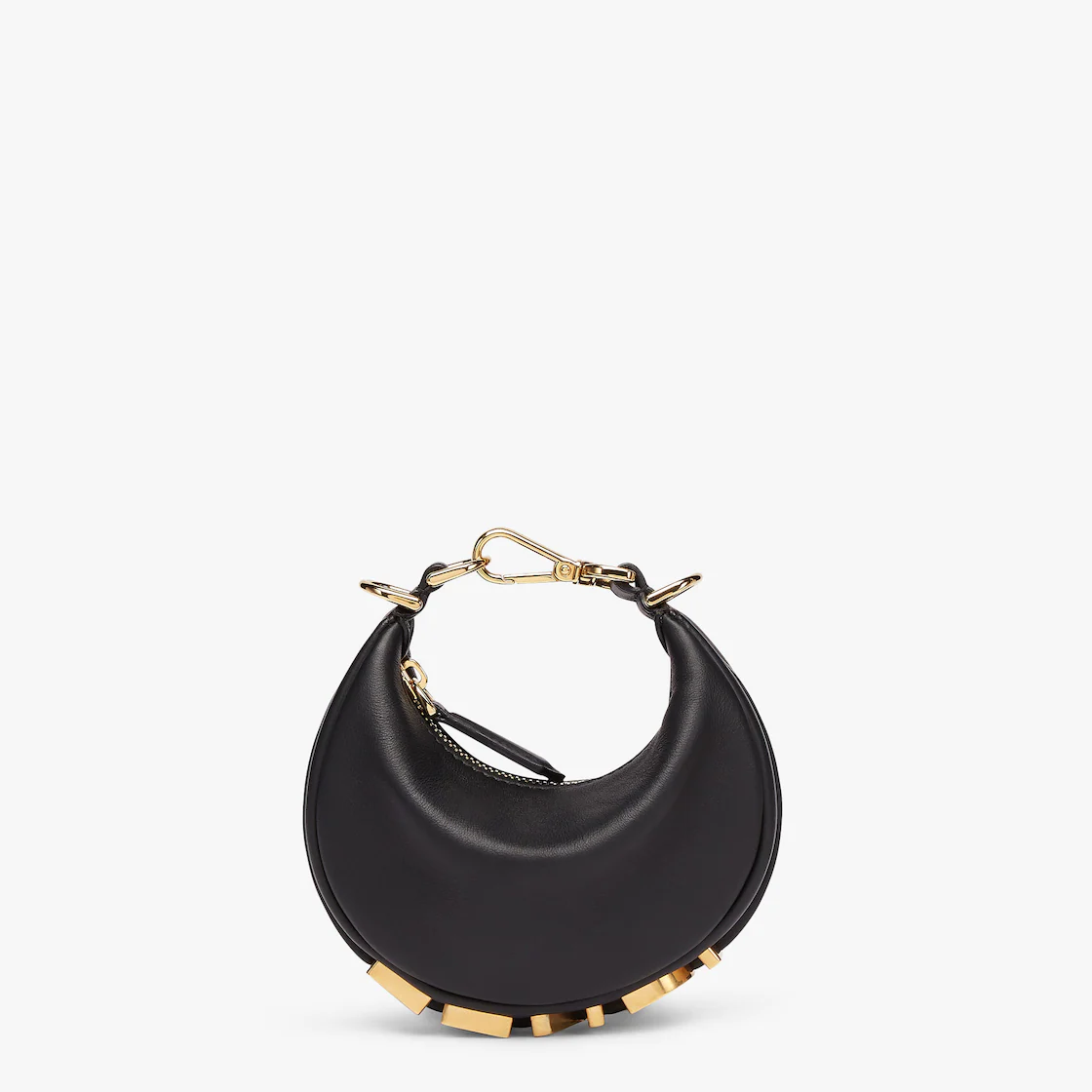 Fethtndigraphy Nano version hobo bag with zip fastening, decorated with Fethtndi lettering in vintage gold-colored metal. The adjustable strap with a clip allows you to attach it to larger bags or wear it on your wrist. Equipped with shoulder strap hooks. Made of black leather. Gold-finish metal accessories.