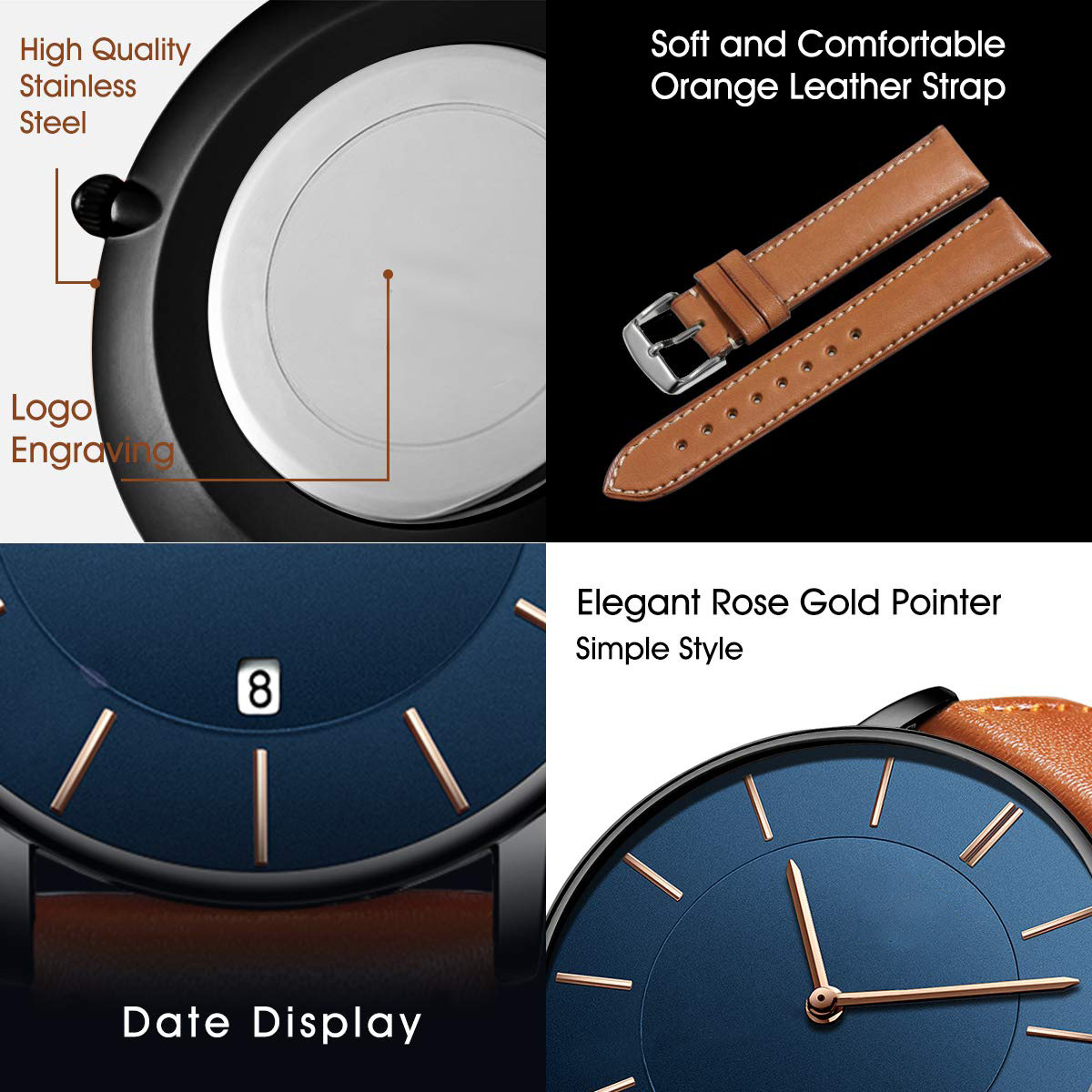 Mens Watch, Minimalist Fashion Simple Wrist Watch Analog Date with Leather Strap