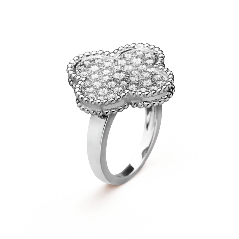 Magic Alhambra ring, rhodium plated 18K white gold, round diamonds; diamond quality DEF, IF to VVS.