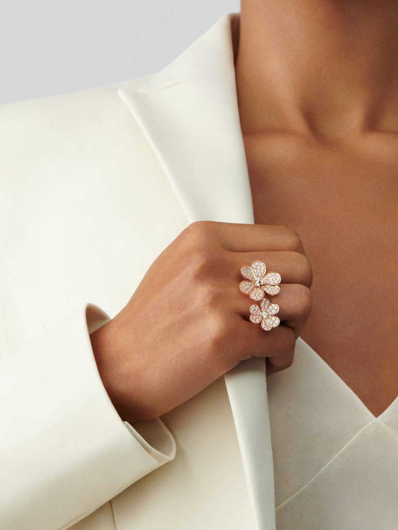Like so many flowers dancing in the breeze, the Frivole® creations by Vthtan Clthteef & Arthtpels stand out with their graphic and airy aesthetic. Mirror-polished 18K gold or diamonds bestow a singular radiance upon heart-shaped petals.