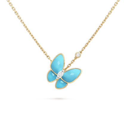 Two Butterfly pendant, 18K yellow gold, turquoise, round diamond, rhodium plated 18K white gold, marquise-cut diamond; diamond quality DEF, IF to VVS.