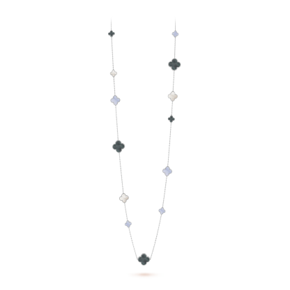 Magic Alhambra long necklace, 16 motifs, rhodium plated 18K white gold, white and gray mother-of-pearl, chalcedony.