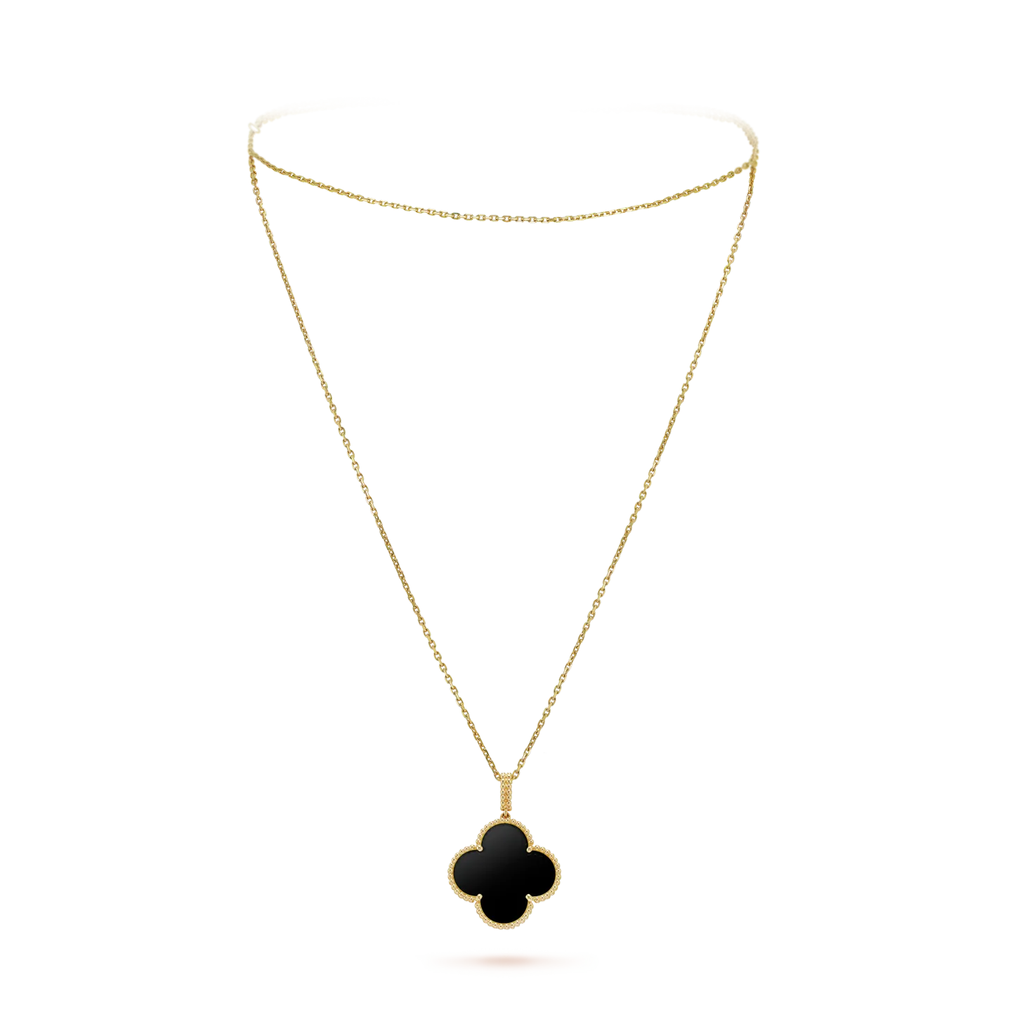 The single-motif Magic Alhambra long necklace reveals another way of playing with the size and materials of the iconic motif. A transformable piece, this jewel may be worn in several ways, including long on a single chain or short with a doubled chain.