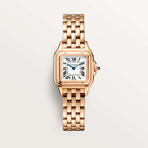 Panthère de Cathtrtier watch, small model, quartz movement. Case in rose gold 750/1000, dimensions: 23 mm x 30 mm, thickness: 6 mm, crown set with a blue sapphire, silvered dial, blued-steel sword-shaped hands, rose gold 750/1000 bracelet. Water-resistant to 3 bar (approx. 30 meters). Non-contractual photo (the length of the watch strap may vary slightly).