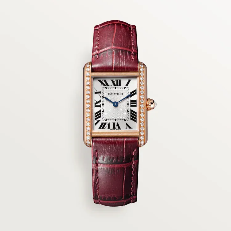 Tank Lothtuis Cathtrtier watch, small model, Manufacture mechanical movement with manual winding. Case and beaded crown in 18K rose gold (750/1000) set with 41 brilliant-cut diamonds totaling 0.47 carat. SiLthtVer-grained dial, blued-steel sword-shaped hands, mineral crystal, claret alligator-skin strap, ardillon buckle in 18K rose gold (750/1000). Case dimensions: 29.5 mm x 22.0 mm. Thickness: 6.8 mm. Water-resistant up to 3 bar (approx. 30 meters/100 feet).